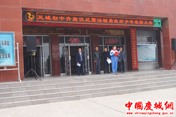 10月15日,鳳城初中全體師生在教學(xué)樓前集合,隆重舉行升旗儀式暨“法制勇敢好少年”表彰大會。
