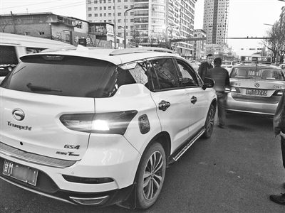 西峰區(qū)秦霸嶺路口,私家車和出租車發(fā)生事故后,兩名司機發(fā)生矛盾。本報記者 鄭朝靜 攝