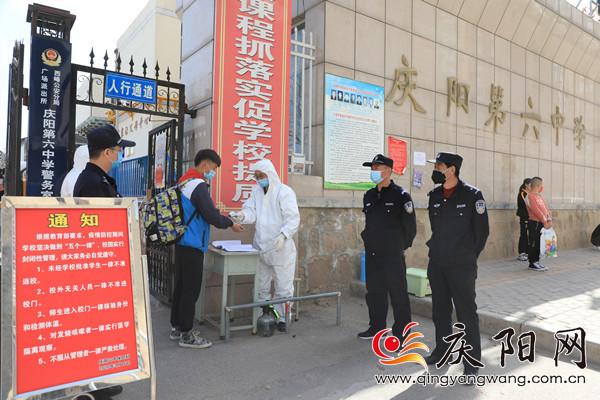 ?慶陽六中學(xué)生進(jìn)校前接受體溫檢測。記者黃飛 攝