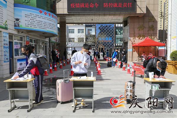 慶陽二中高三級返校學(xué)生在登記出入信息、消毒。見習(xí)記者俄少飛 攝