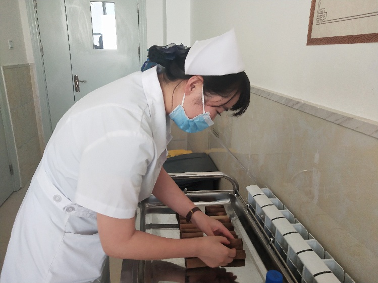 護(hù)士正在整理藥物罐療法中使用的竹罐。實習(xí)生唐曉慶 攝