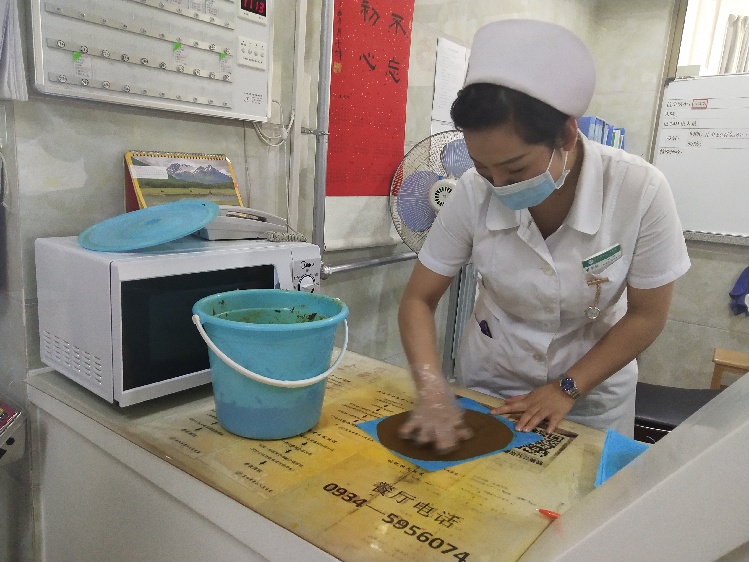 護(hù)士正在準(zhǔn)備中藥擦涂療法中所用的藥物。實習(xí)生唐曉慶 攝