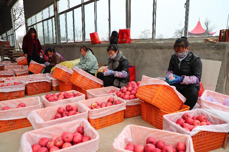合水縣新興有機農產品農民專業(yè)合作社內,來自四川的客商正在分揀裝箱蘋果。