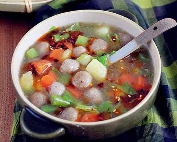 肉丸糊辣湯是西安回民清真小吃,是最受西安人歡迎的早餐之一。制作原料主要有牛肉、土豆、蓮花白等。吃前澆一勺店家精心熬制的紅艷艷的辣椒油,吃罷舌尖發(fā)麻,微微冒汗,渾身舒坦。