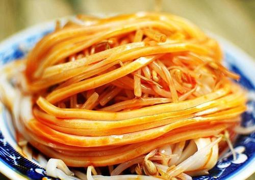 秦鎮(zhèn)米皮,用大米磨漿蒸成。米皮色白、光潤、皮薄、細軟、柔韌,吃起來酸、辣、筋、爽、涼,別有一番風味。