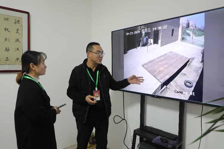 杜正新和員工通過(guò)監(jiān)控查看牛場(chǎng)情況。
