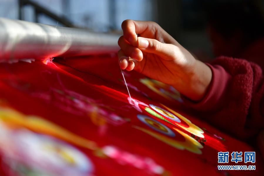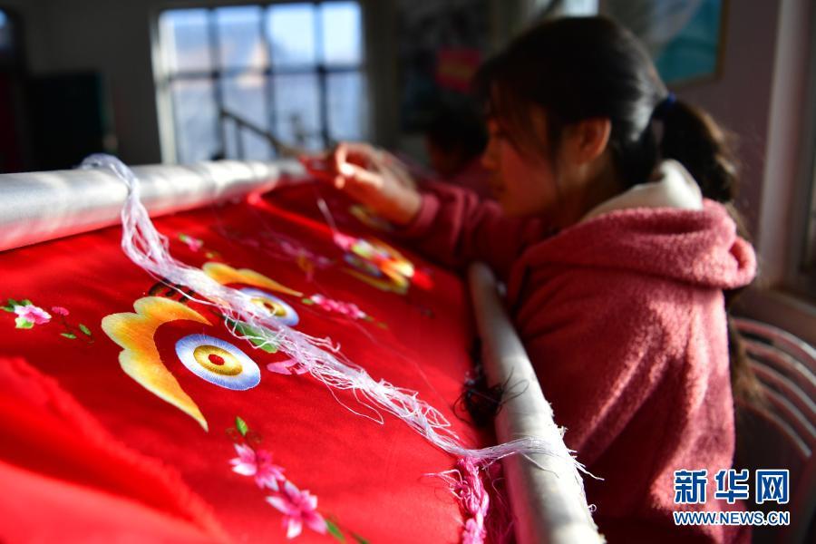 村民在甘肅省慶陽(yáng)市群英香包有限公司巾幗扶貧車間刺繡(12月14日攝)。新華社記者 陳斌 攝