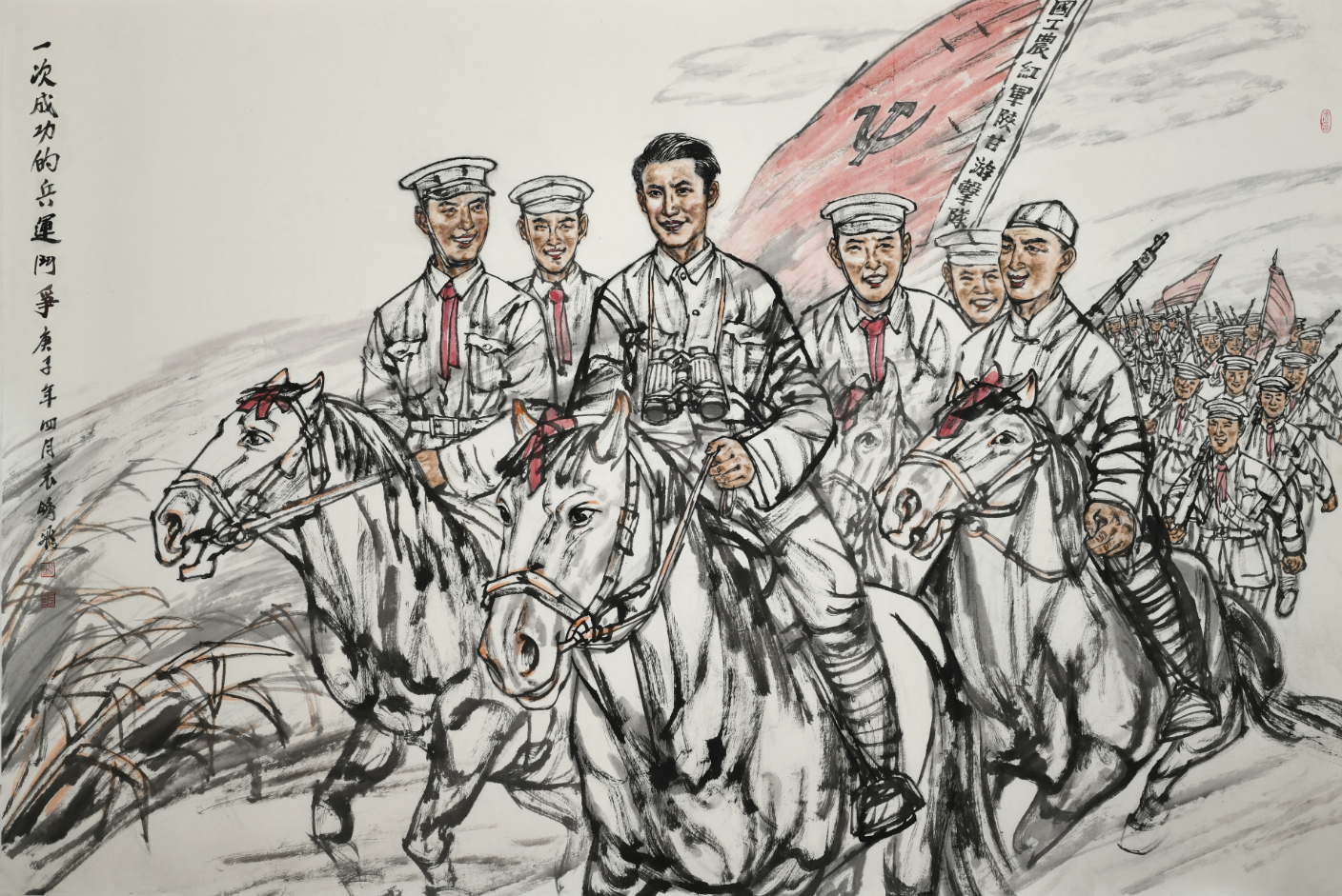 前來迎接起義隊伍的是工農(nóng)紅軍陜甘游擊隊騎兵大隊。大隊長強龍光是陜北安定人,與楊林是同鄉(xiāng)、同學(xué)和老朋友。只見強龍光穿一身藍色便服,手里提著馬尾蠅刷,兩把盒子槍左右交叉掛在身上,騎一匹棗紅大馬,十分威武。副大隊長楊琪是陜西延川人,戴一頂瓜皮帽,胖胖的圓臉,留著八字胡須,穿一身商人衣服,手拿白色蠅刷,身掛一把盒子槍,騎一匹大白馬。政委楊森是陜西乾縣人,穿一身學(xué)生服,掛一把盒子槍,騎一匹大黃馬。其余官兵都是老百姓的裝扮,有的還穿著和尚道士衣服,但每個人脖子上都系著一條表示忠于革命、勇敢殺敵標志的“犧牲帶”。短暫歡聚之后,在騎兵大隊引導(dǎo)下,起義部隊繼續(xù)朝北前進,當晚與中國工農(nóng)紅軍陜甘游擊隊正式會合。