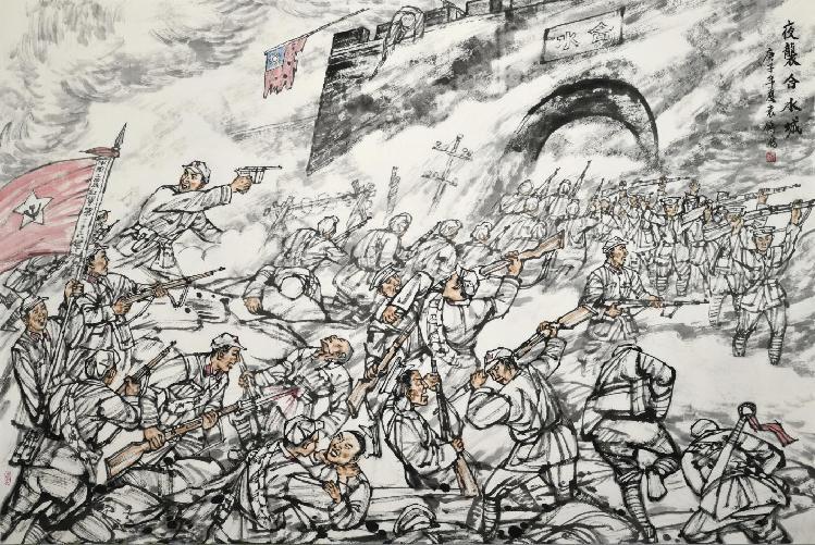 合水縣城易守難攻,加之紅軍缺乏攻堅武器,采取強攻硬打顯然很難奏效。劉志丹綜合分析了敵情和地形后,決定采取偷襲的辦法,挑選出20多名機(jī)智勇敢的干部、戰(zhàn)士,由強世卿帶領(lǐng),組成登城突擊隊,以紅四團(tuán)二連和陜北一支隊組成主攻連,其余部隊在城外隱蔽。王世泰擔(dān)任攻城總指揮,他立即召集突擊隊全體戰(zhàn)士宣布任務(wù):將突擊隊分為3個組,每組10人,任命王安民任第一組組長,陳國棟任第二組組長,張明吾任第三組組長,開始準(zhǔn)備云梯、繩子等攻城工具。天黑后,部隊冒雨從黑木原出發(fā),突擊隊走在最前面。夜黑得伸手不見五指,指戰(zhàn)員踩著泥濘的小路,深一腳淺一腳地前進(jìn)。經(jīng)過30多里的艱難行軍,深夜3點多,突擊隊神不知鬼不覺地摸到東城門北邊溝里的預(yù)定爬城地點,其他部隊也按預(yù)定方案進(jìn)入陣地。因為夜色漆黑,加之城池堅固,守城敵人認(rèn)為神兵天將也奈何他不得,早已進(jìn)入夢鄉(xiāng)。城樓上的哨兵哼著小調(diào)來回走,對紅軍兵臨城下毫無察覺。