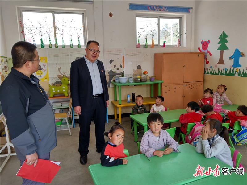 2019年5月9日,邱軍(左二)在華池縣城壕鎮(zhèn)太陽(yáng)幼兒園了解辦學(xué)情況。