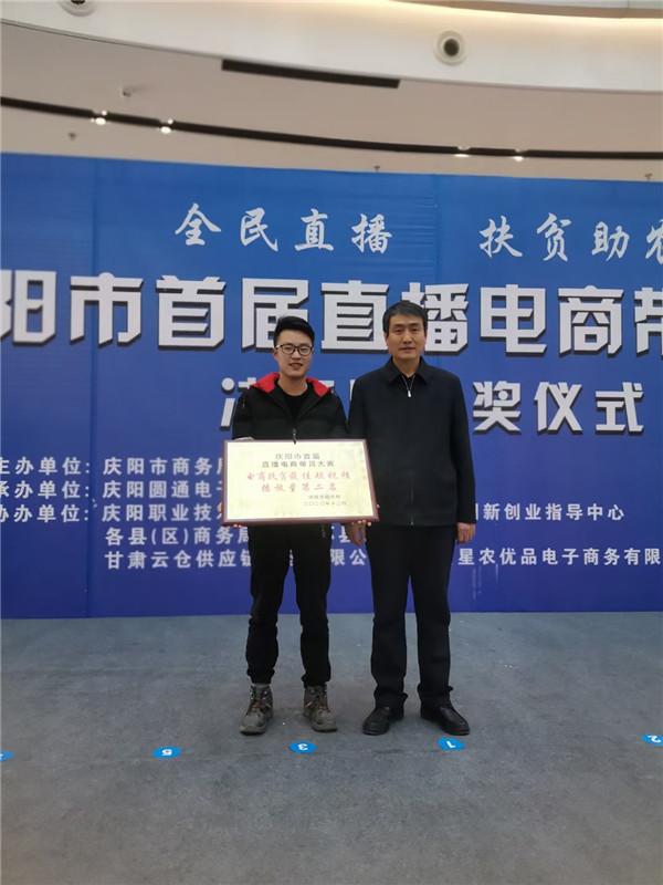 2020年10月,張瑞江和10個校友組建直播團隊,報名參加了慶陽市“全民直播·扶貧助農(nóng)”首屆直播電商帶貨大賽,比賽中他們嶄露頭角,當天就收益2.3萬元。在總決賽中,他以出色的剪輯技術(shù)和表現(xiàn)手法脫穎而出,榮獲最佳短視頻播放量第二名。