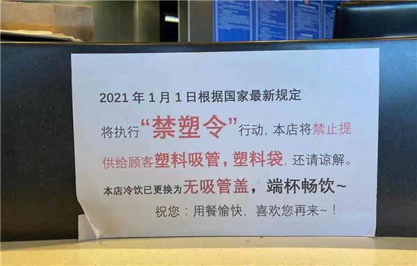 某餐飲店內(nèi)張貼的“限塑令”標(biāo)語(yǔ)。見習(xí)記者米靜攝