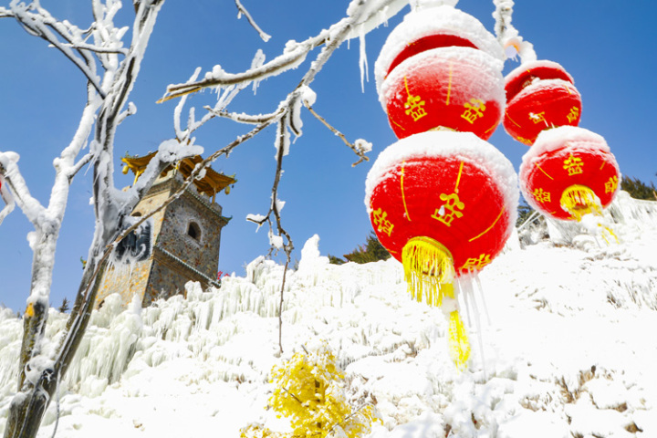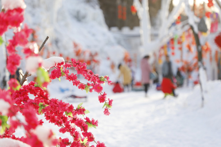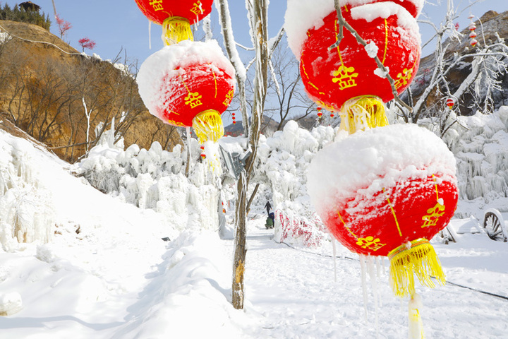 景點(diǎn)內(nèi)一片銀裝素裹,樹木上懸掛起大紅燈籠和中國結(jié),營造起了濃濃年味。