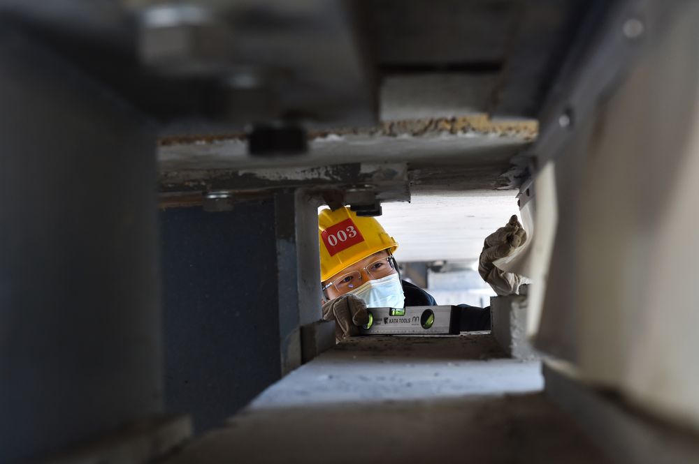 2月9日,在鄭太高鐵太焦段的白北村烏馬河大橋,工人郭永強(qiáng)使用水平儀進(jìn)行檢測(cè)。新華社記者 柴婷 攝