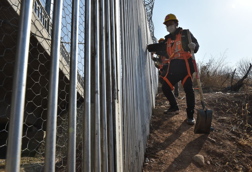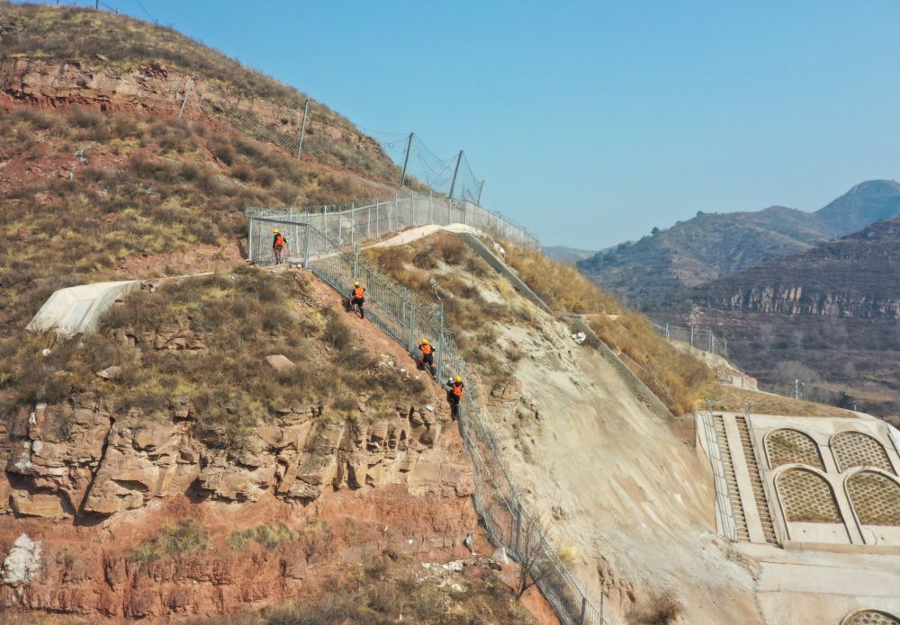 2月9日,在鄭太高鐵太焦段的白北隧道附近,作業(yè)人員在檢測(cè)線路防護(hù)柵欄是否松動(dòng)。新華社記者柴婷 攝