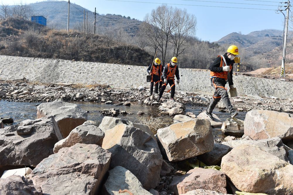 2月9日,在鄭太高鐵太焦段的白北隧道附近,申源(右)和工友通過一條小河前往下一個(gè)檢修點(diǎn)。新華社記者柴婷 攝