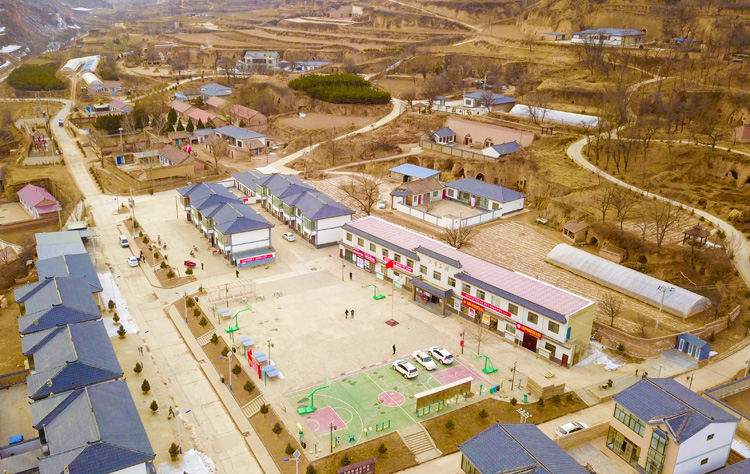 圖為無(wú)人機(jī)航拍下的大堡子村文化廣場(chǎng)和居民點(diǎn)。
