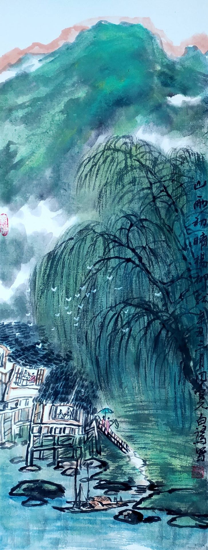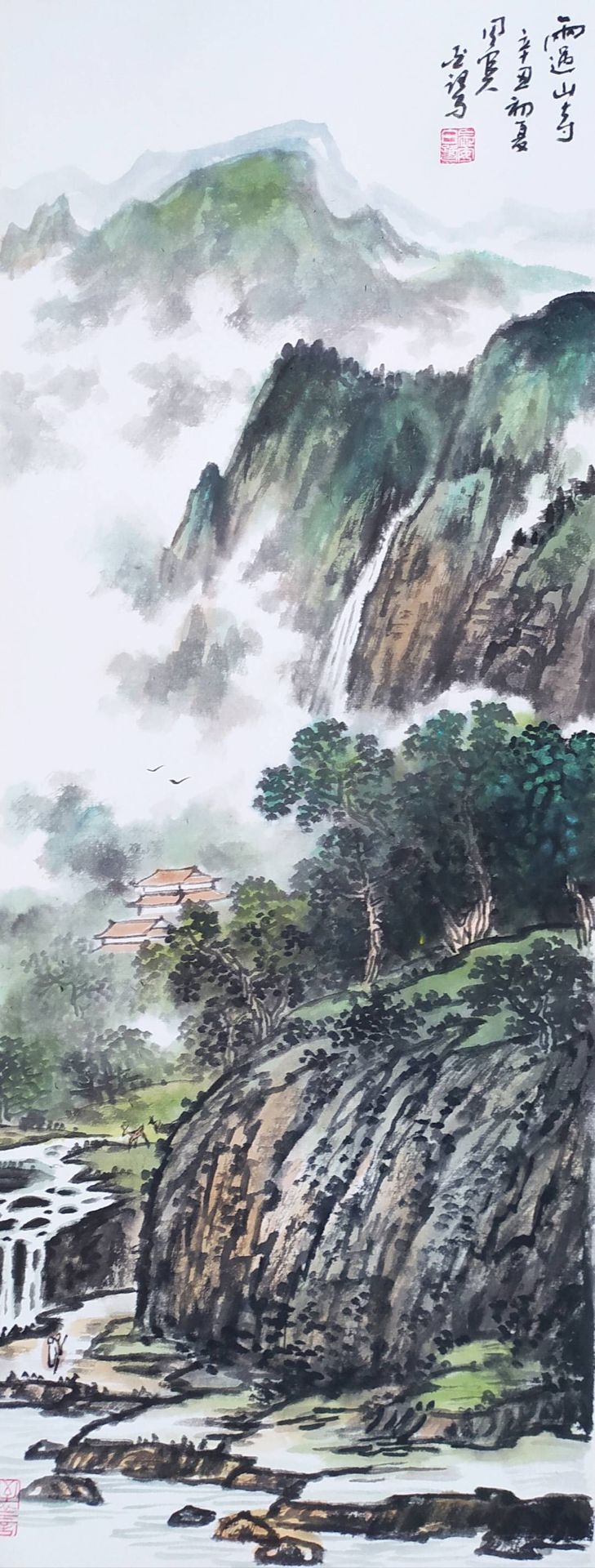 孟老師的山水畫具有強烈的個人色彩,它是畫家基于寫生的心靈印記,由于常在鄉(xiāng)間行走,也曾深居山寺,對黃土高原地貌的深厚感情,加之大量的專業(yè)創(chuàng)作,形成了其獨具匠心的繪畫面貌。身處其間,他的中國畫筆墨技法提升了新的層次,山水的自然之美與人的內(nèi)在精神渾然一體。