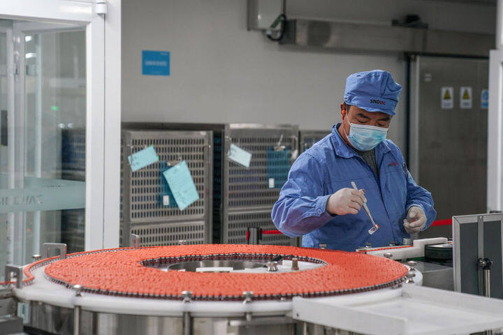 2021年7月8日,工作人員在北京科興疫苗生產(chǎn)流水線上工作。新華社記者彭子洋攝