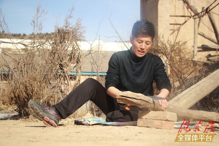 李富富在鋸生火用的木頭。隴東報(bào)全媒體記者 南力 攝
