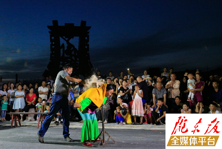 傍晚,外鄉(xiāng)藝人在慶城縣南門周禮廣場表演雜技(2017年8月8日攝)。