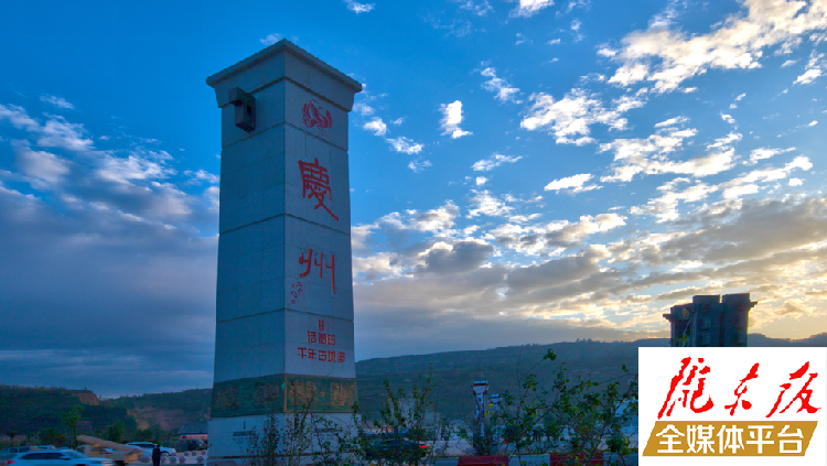 慶城縣南門周禮廣場刻有“慶州”二字的石柱與銅鼎相對應(yīng)(2017年9月23日攝)。