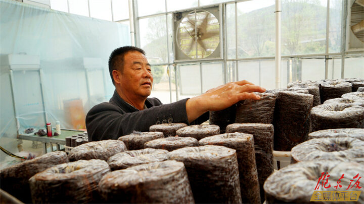 慶陽(yáng)雙升農(nóng)業(yè)開(kāi)發(fā)有限公司技術(shù)總監(jiān)梁?jiǎn)⑽模ㄗ螅┡c華池縣工作人員查看菌棒。 路世玲攝