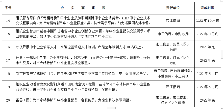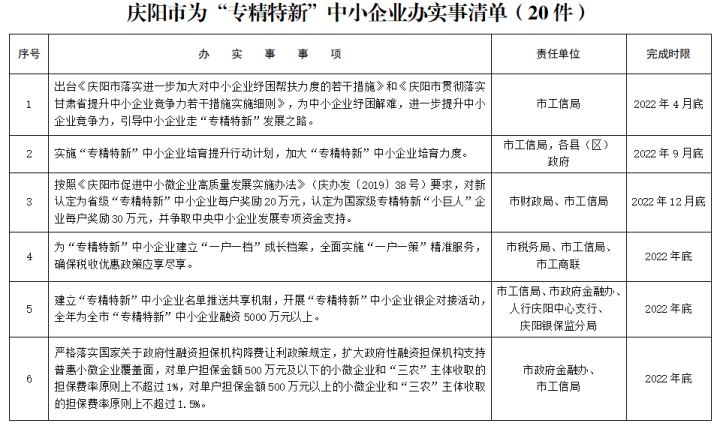 清單提出,制定出臺(tái)《慶陽(yáng)市落實(shí)進(jìn)一步加大對(duì)中小企業(yè)紓困幫扶力度的若干措施》和《慶陽(yáng)市貫徹落實(shí)甘肅省提升中小企業(yè)競(jìng)爭(zhēng)力若干措施實(shí)施細(xì)則》,幫助中小企業(yè)紓困解難;為“專精特新”中小企業(yè)建立“一戶一檔”成長(zhǎng)檔案,全面實(shí)施“一戶一策”精準(zhǔn)服務(wù),確保稅收優(yōu)惠政策應(yīng)享盡享;建立“專精特新”中小企業(yè)名單推送共享機(jī)制,開展“專精特新”中小企業(yè)銀企對(duì)接活動(dòng),全年為全市“專精特新”中小企業(yè)融資5000萬(wàn)元以上。