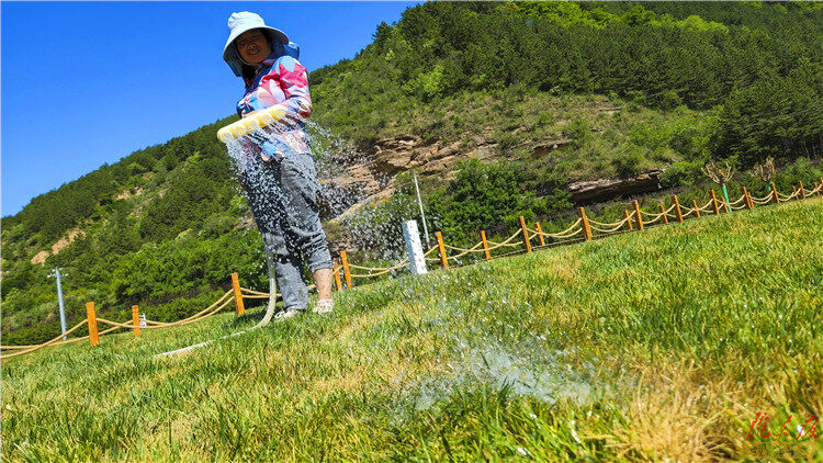 ↑6月16日,在合水縣花溪谷生態(tài)旅游景區(qū),工人們給新栽植的花卉和綠化樹(shù)木除草、澆水,各項(xiàng)基礎(chǔ)設(shè)施及配套設(shè)施建設(shè)進(jìn)入收尾階段。