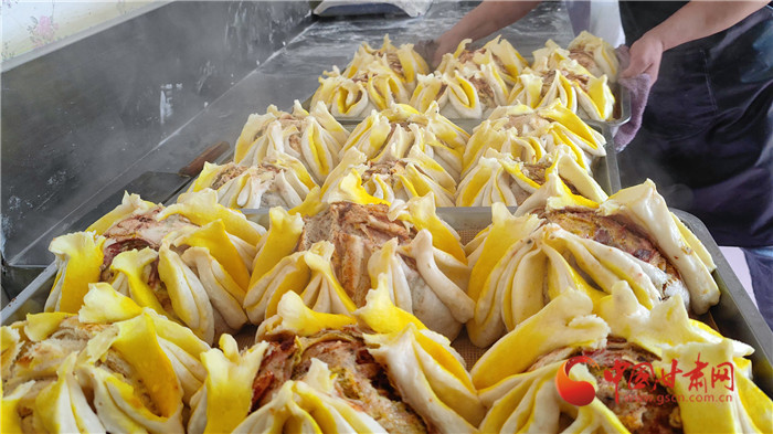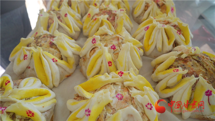 記者走進(jìn)榆中縣金崖鎮(zhèn)浩燕饅頭店,一股濃濃的胡麻油、玫瑰醬、香豆等混合的香氣撲面而來,李浩燕正在忙碌地趕制一批榆中傳統(tǒng)手工月餅。案板上除了發(fā)好的面團(tuán),還擺上了炒胡麻碎、姜黃、白砂糖等豐富的佐料。只見李浩燕從揉面開始,然后鋪餡、搟制、卷面、切分、披花,一道道工序一氣呵成。經(jīng)過一個(gè)多小時(shí),新鮮美味的月餅出爐了,切開后,內(nèi)里豐富,色彩斑斕,咬上一口軟糯可口,回味留香。