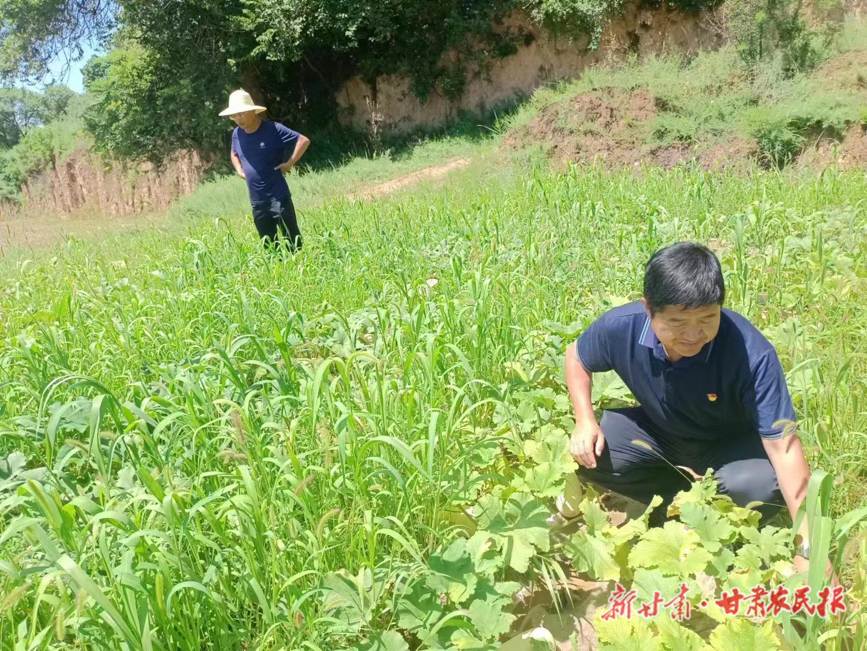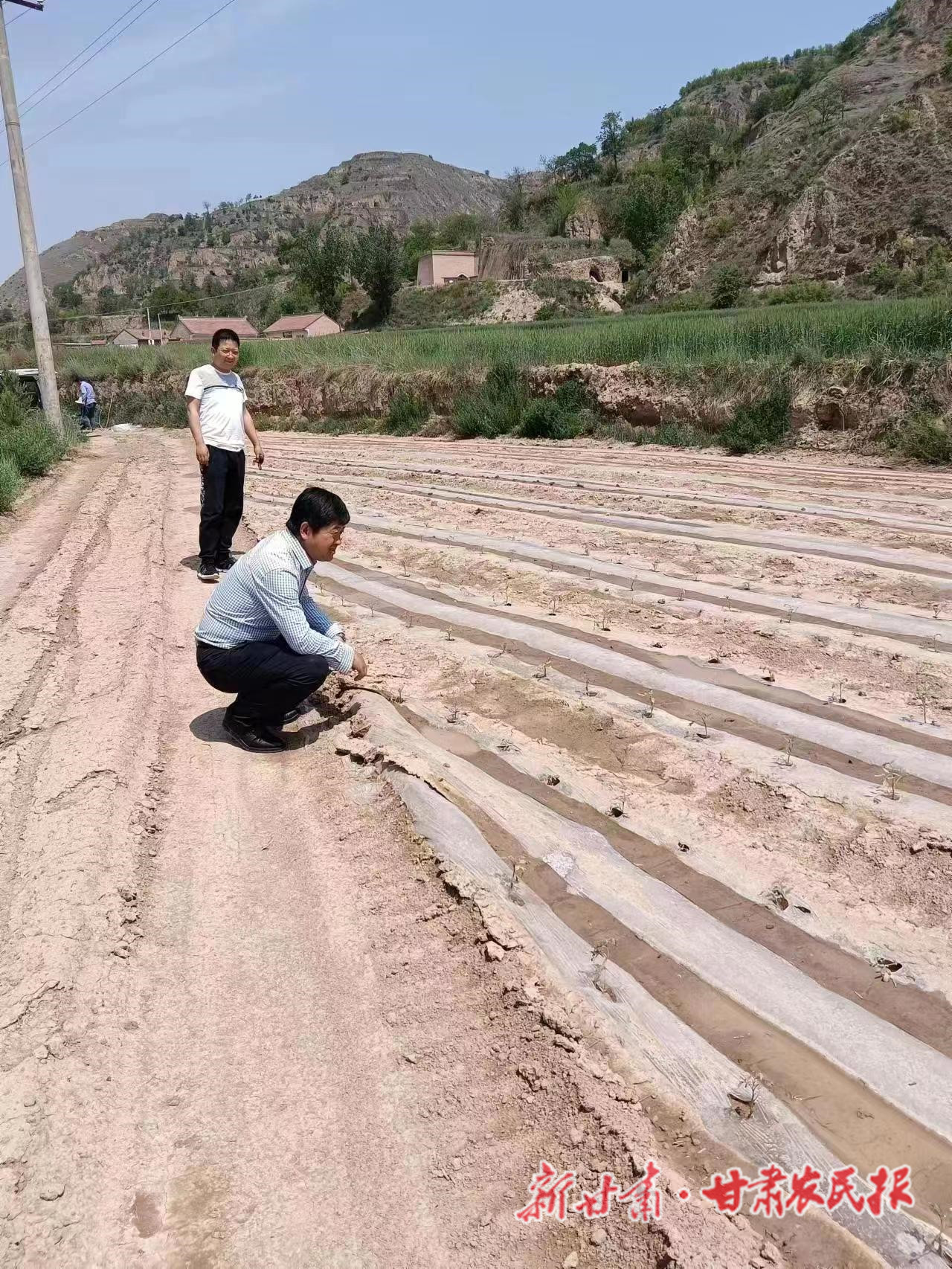 任廷樓查看白瓜子、玉米出苗情況。新甘肅·甘肅農(nóng)民報(bào)通訊員田曉博 攝
