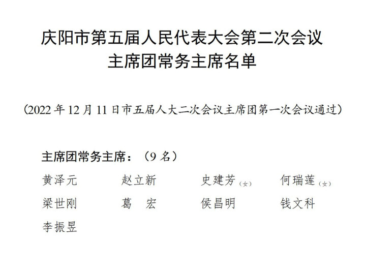 【受權(quán)發(fā)布】慶陽市第五屆人民代表大會第二次會議主席團(tuán)常務(wù)主席名單