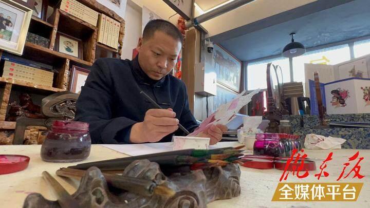 1月12日,在環(huán)州故城道情皮影館內,41歲的張治文伏于桌案,左手轉動牛皮,右手執(zhí)刀雕刻,十幾把刀在張治文手中來回轉換,鋒利的刀尖在牛皮上時而扎、時而推、時而鑿,經過四個多小時的精心打磨,一幅傳統(tǒng)皮影與現代潮流元素相融合的“年畫兔”栩栩如生地呈現了出來。