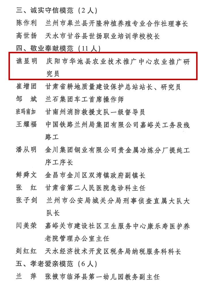 近日,甘肅省精神文明建設指導委員會發(fā)布《關于表彰第八屆甘肅省道德模范的決定》,授予全省30名同志第八屆甘肅省道德模范稱號。其中,華池縣農(nóng)業(yè)技術推廣中心農(nóng)業(yè)推廣研究員譙顯明,光榮入選榮獲敬業(yè)奉獻類道德模范稱號。