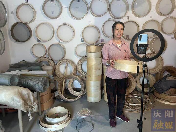 莊子峁生態(tài)農(nóng)莊的農(nóng)戶在直播銷售自家制作的籮筐。