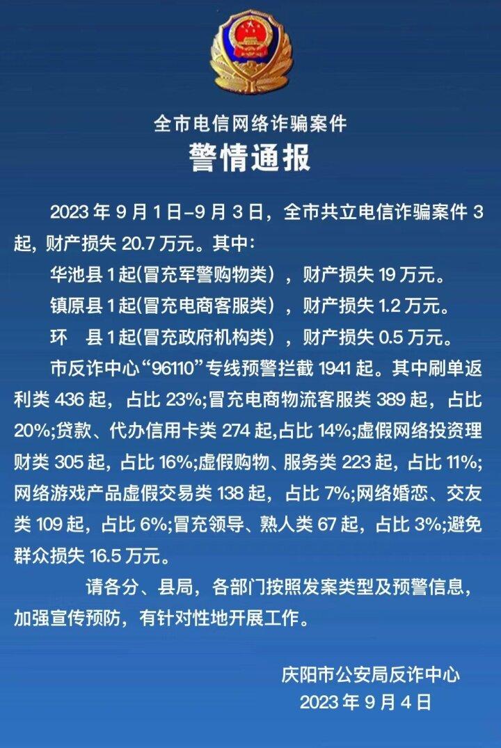 【法治慶陽】財產(chǎn)損失20.7萬元!慶陽市發(fā)布9月1日至3日電信網(wǎng)絡詐騙案件警情通報