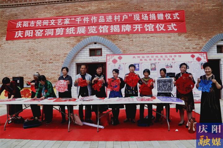 初見(jiàn)秦菊林,是在慶陽(yáng)市民間文藝家“千件作品進(jìn)村戶”現(xiàn)場(chǎng)捐贈(zèng)暨慶陽(yáng)窯洞剪紙展覽館揭牌開(kāi)館儀式上。當(dāng)天,西峰區(qū)董志鎮(zhèn)寺里田村郭家大院的一孔孔窯洞,被紅彤彤的剪紙烘托得喜慶、溫暖。隨機(jī)走進(jìn)一間窯洞,門口右手邊的土炕上,三五個(gè)剪紙藝人盤腿而坐,一把把靈活的剪刀游走在紅色紙面上,不一會(huì)兒,一張張剪紙作品便躍然眼前,秦菊林就在其中。