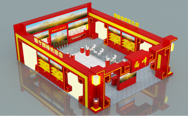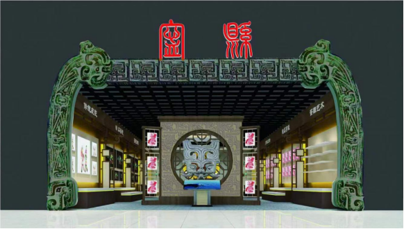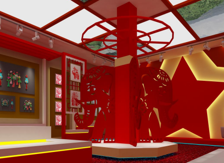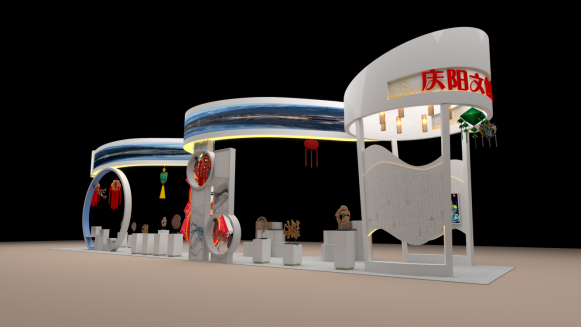 展廳入口設(shè)計(jì)鏤空立體雕刻兩個(gè)吉“象”門迎,門頭上面設(shè)計(jì)曲面波動(dòng)造型及交織飄帶造型,立體發(fā)光大字“合水”。展廳正中心設(shè)計(jì)傳統(tǒng)兩組大象立體造型,用于懸掛各類民俗產(chǎn)品等,中間位置設(shè)置多層展臺(tái)擺放面塑等作品。展廳正面設(shè)計(jì)立體規(guī)則的多層五角星輪廓、四周設(shè)計(jì)燈帶,作為中心展臺(tái)展位,便于擺放、懸掛民俗文化展品。突出展示合水面塑、香包、根雕、刺繡等。展廳兩個(gè)側(cè)面設(shè)計(jì)鏤空立體雕刻6組,用于懸掛刺繡剪紙等作品,虛實(shí)結(jié)合,下面設(shè)計(jì)展臺(tái),突出展示合水其他大小件擺件等。展廳頂子設(shè)計(jì)不同的拉布燈箱及角花,采用圖案以合水五張名片為主。