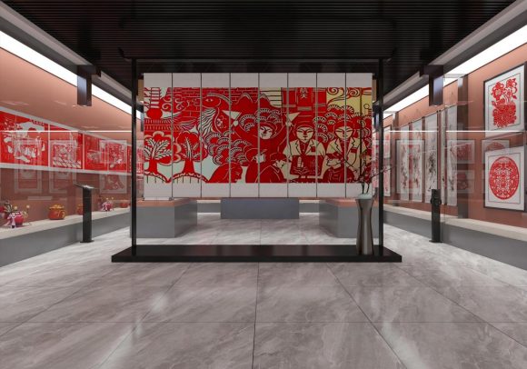 東、南、北三墻面布置版塊一剪紙作品,南北兩側(cè)靠墻設(shè)置展臺(tái)若干,展示版塊二、三、四作品。