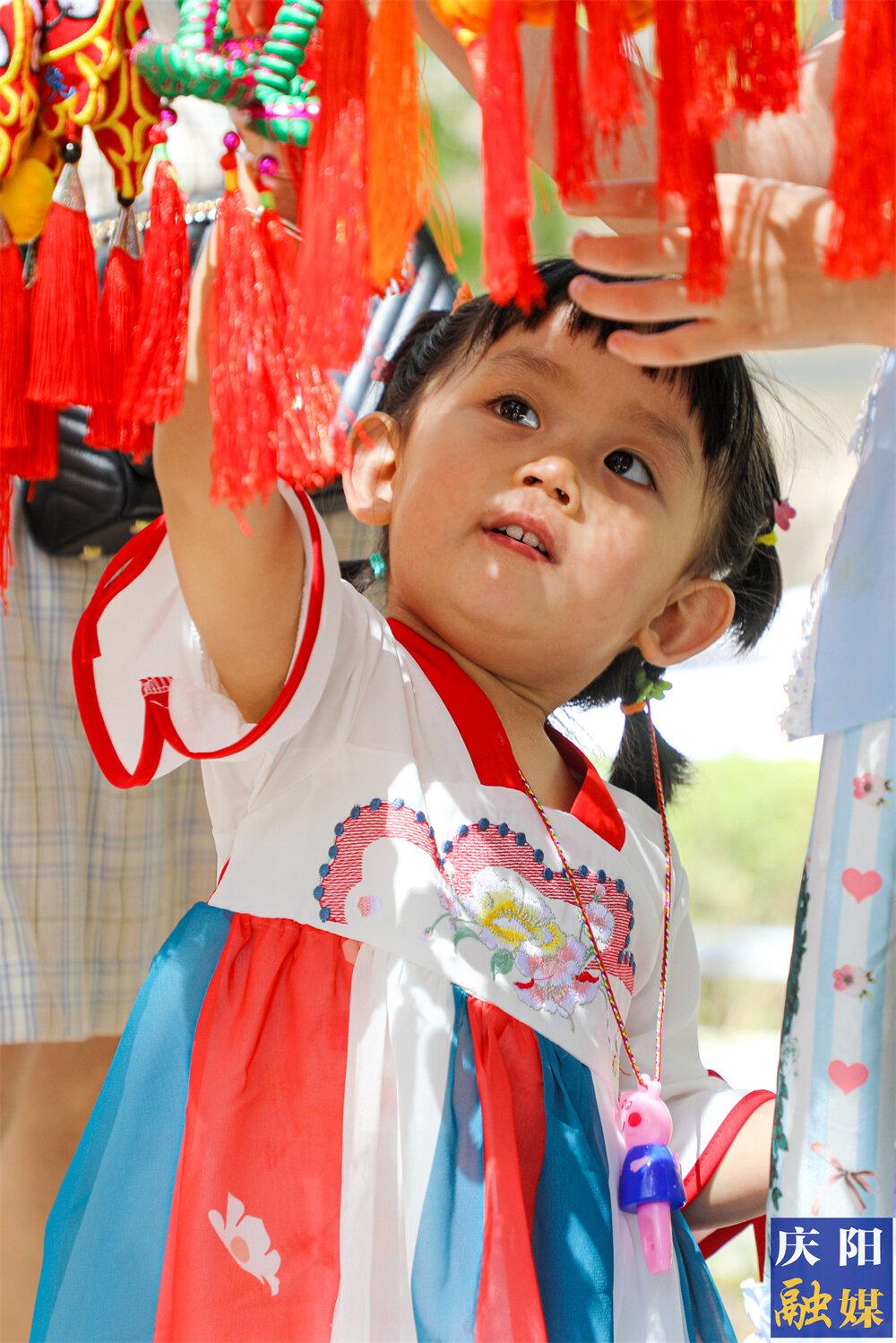 小朋友在街頭挑選喜歡的香包。慶陽融媒特約攝影 俄少飛 攝