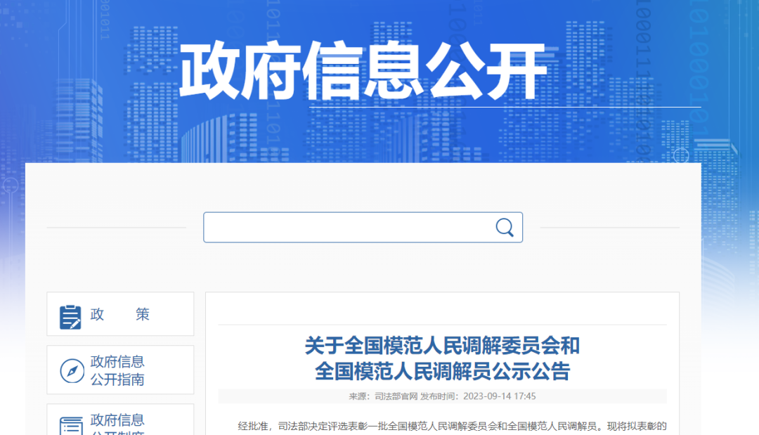經(jīng)批準,司法部決定評選表彰一批全國模范人民調(diào)解委員會和全國模范人民調(diào)解員?,F(xiàn)將擬表彰的全國模范人民調(diào)解委員會和全國模范人民調(diào)解員名單予以公示。公示期為即日起至2023年9月21日。公示期內(nèi),有關(guān)單位和個人可通過信函、傳真、電子郵件形式向司法部反映情況。以單位名義反映情況的材料需加蓋單位公章,以個人名義反映情況的材料應(yīng)署實名,并提供聯(lián)系電話。歡迎社會各界予以監(jiān)督。