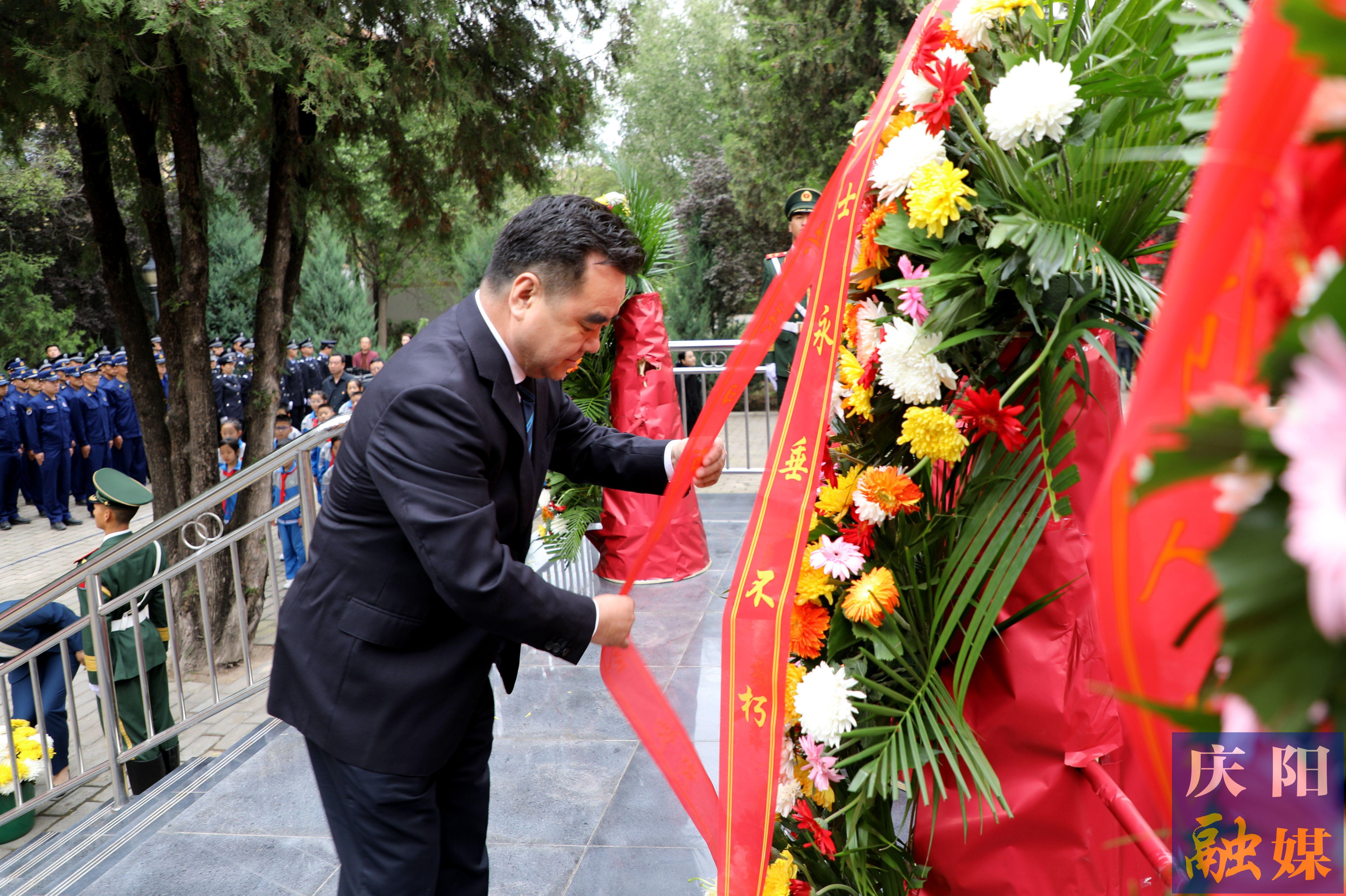 慶城縣烈士陵園莊嚴肅穆,蒼松翠柏守護著高聳的烈士紀念塔。各界代表面向烈士紀念塔整齊列隊,市委、市人大常委會、市政府、市政協(xié)、慶陽軍分區(qū)、慶城縣委縣政府、社會團體和社會各界群眾敬獻的花籃整齊擺放,花籃紅色緞帶上“烈士永垂不朽”6個金色大字熠熠生輝。