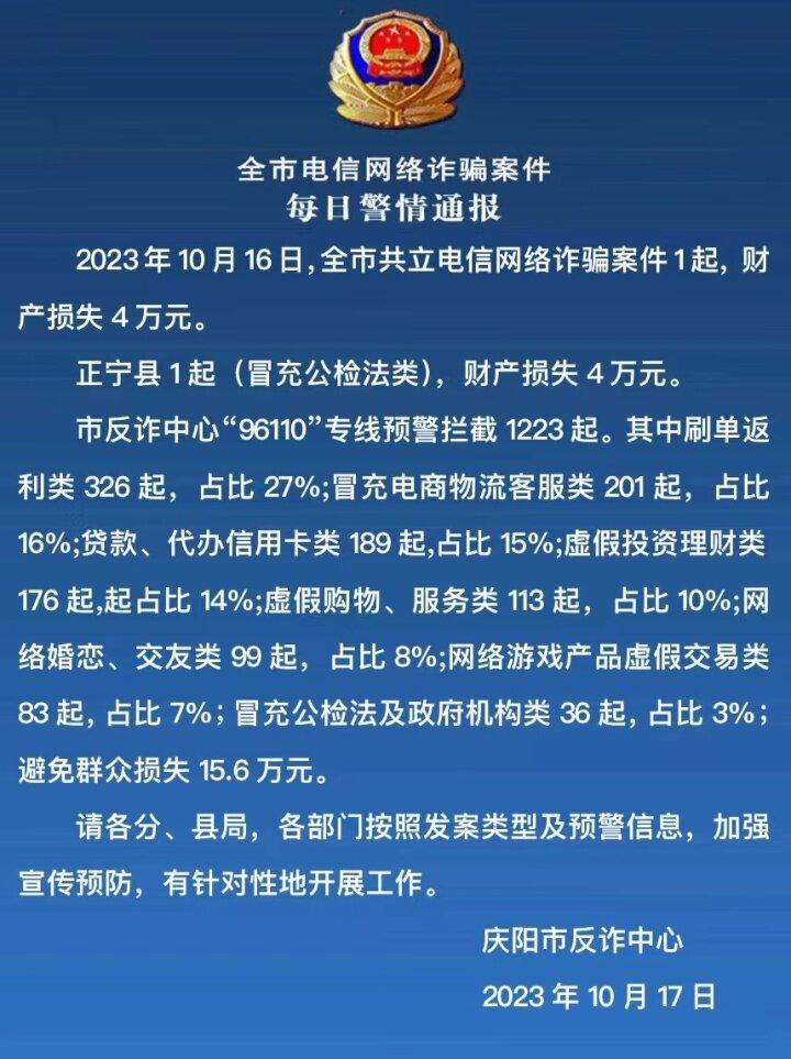 【法治慶陽】一人被騙4萬元!慶陽公安發(fā)布10月17日電信網(wǎng)絡(luò)詐騙案件警情通報(bào)