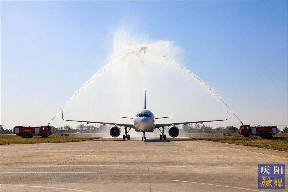 抵達(dá)慶陽機(jī)場的成都=慶陽=青島G54109/10航班“過水門”。