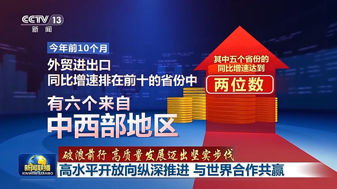 高水平開放,也讓曾經(jīng)的開放“末梢”變成“前沿”。最新數(shù)據(jù)顯示,今年前10個月,外貿(mào)進出口同比增速排在前十的省份中,有六個來自中西部地區(qū)。其中五個省份的同比增速達到兩位數(shù)。