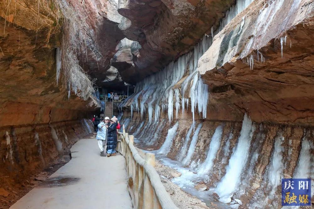 距離隴東滑雪場兩公里處的龍棲谷景區(qū),渾然天成的冰雪奇觀也吸引不少游客賞景拍照。