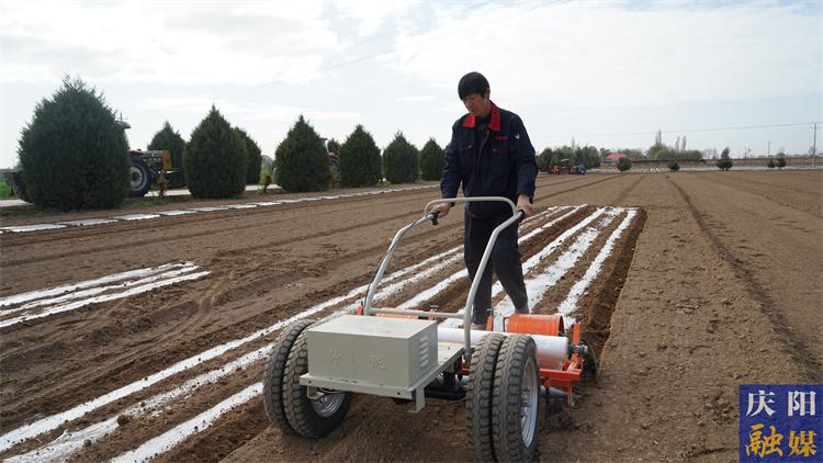 慶陽市技術人員在田間進行自動化覆膜機實操作業(yè)。
