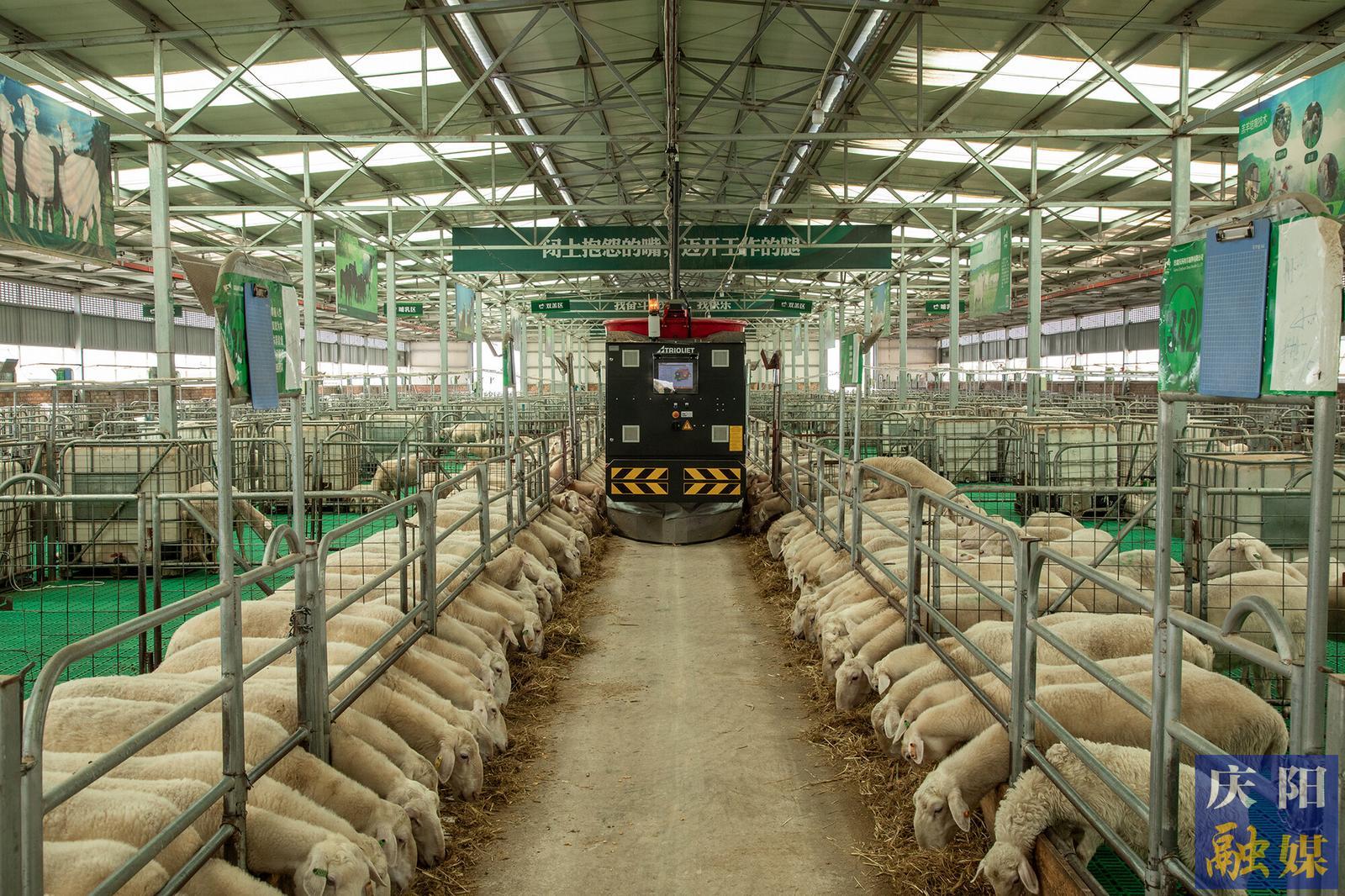 環(huán)縣山城鄉(xiāng)甘肅慶環(huán)肉羊制種基地機器人喂羊(2021年6月13日攝)。特約攝影 張明政 攝
