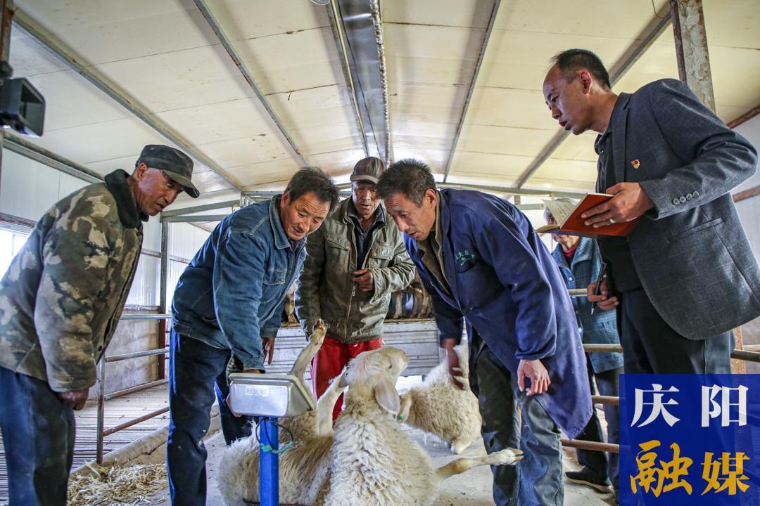 ▲環(huán)縣洪德鎮(zhèn)大戶塬村羔羊育肥場養(yǎng)殖戶正在與工作人員進(jìn)行過磅交售。慶陽融媒記者 曹拯 攝。