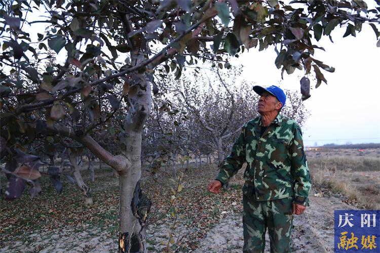 ▲慶城縣驛馬鎮(zhèn)太樂村村民王育祥查看果樹生長(zhǎng)情況。